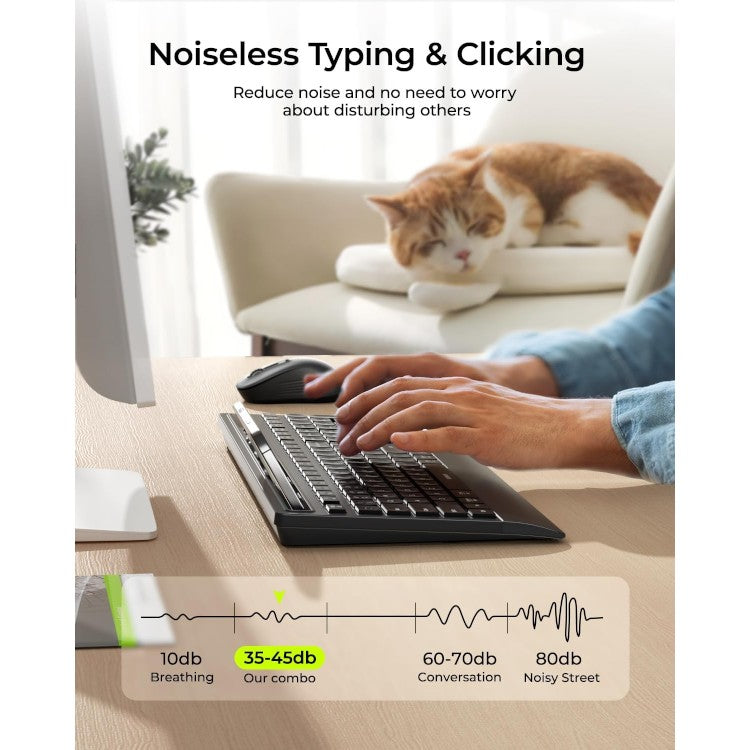 Tipkovnica in miška sta zasnovani za tihi vnos – idealno za delo v skupnih prostorih. Miška omogoča nastavitev DPI: 800 / 1200 / 1600 za prilagodljivo občutljivost.