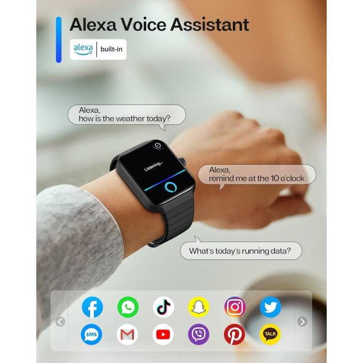 S podporo za Amazon Alexa lahko uro uporabljate za preverjanje vremena, nastavljanje opomnikov, nadzor predvajanja glasbe in še več – samo z glasovnimi ukazi. Prek Bluetooth 5.3 omogoča tudi jasne telefonske klice neposredno z ure, kadar je telefon v dosegu (do 8–10 m).